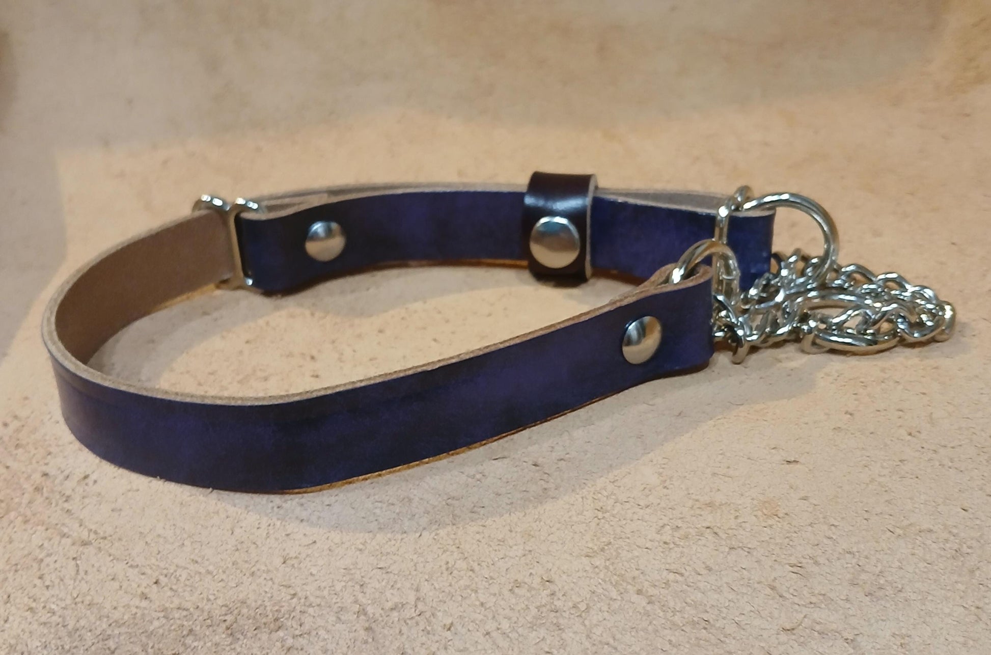 This is a Hand-made 3/4 inch-width leather adjustable Chain Martingale collar. It is made of 8-ounce natural hide leather and is colored in Purple Hart with a Mulberry Rox accent Leather Snap Stopper.